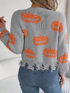 Get ready for the spooky season with this Halloween Pumpkin Pattern Raw Hem V-Neck Sweater. Made from 100% acrylic, this slightly stretchy sweater ensures both comfort and style. The raw hem detailing and festive pumpkin pattern add a playful touch to your fall wardrobe. Perfect for dress-up events, casual wear, and embracing Halloween spirit in style. Easy to care for with machine wash cold and tumble dry low instructions. Imported and crafted for fun and cozy occasions.